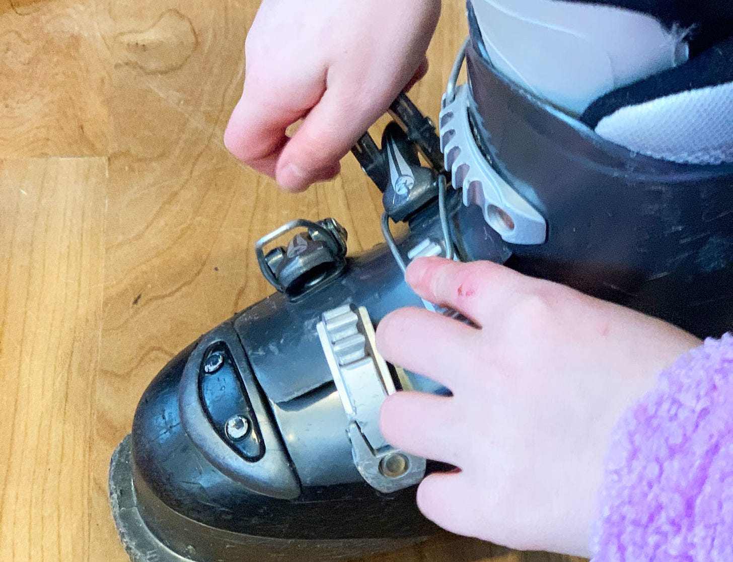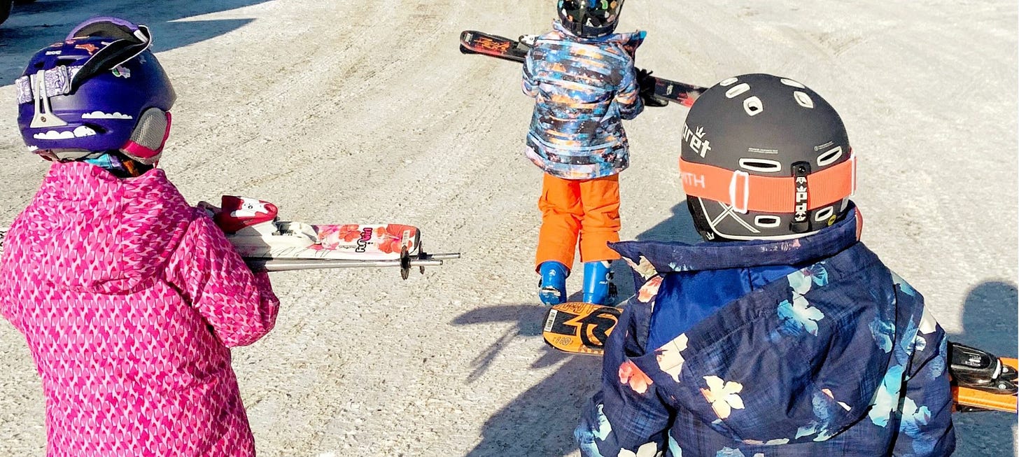 On ski day, it takes about a half hour to get everyone outfitted in their gear. And let me tell you, the struggle is real. Getting those ski boots on can be quite the challenge and is almost guaranteed to bring about tears from at least one of the kiddos.